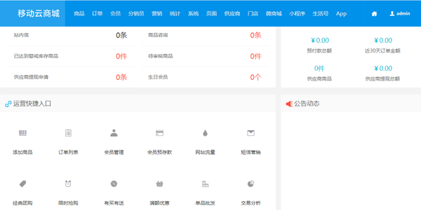 6、后臺支(zhi)持(chi)系(xi)統包含商品管理(li)(li)、訂單管理(li)(li)、會員管理(li)(li)、分銷員管理(li)(li)、營銷中心、統計分析、基本(ben)設置(zhi)、頁面管理(li)(li)、供應(ying)商管理(li)(li)、門店管理(li)(li)、微商城(cheng)管理(li)(li)、小程序管理(li)(li)、生活號(hao)設置(zhi)等模塊。