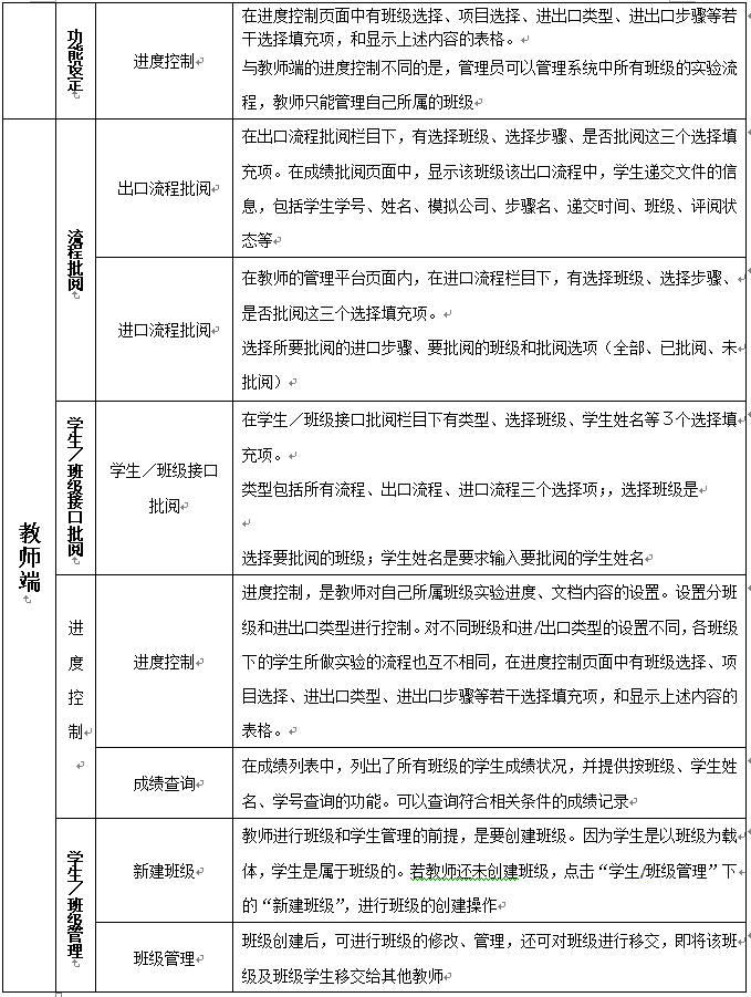 2.權限(xian)分為管(guan)理員、教(jiao)(jiao)師(shi)(shi)和學(xue)(xue)(xue)生(sheng),其(qi)中學(xue)(xue)(xue)生(sheng)端在首頁以出(chu)口(kou)(kou)流程(cheng)、進(jin)口(kou)(kou)流程(cheng)、資(zi)費信息(xi)、幫助、注(zhu)冊等(deng)模塊顯示。教(jiao)(jiao)師(shi)(shi)通過兩個權限(xian)對用戶、實驗基(ji)礎數據、實驗進(jin)程(cheng)等(deng)方面進(jin)行(xing)(xing)有效的(de)管(guan)理。教(jiao)(jiao)師(shi)(shi)通過系(xi)統中的(de)獨立端口(kou)(kou)對班(ban)級學(xue)(xue)(xue)生(sheng)進(jin)行(xing)(xing)管(guan)理,可(ke)對學(xue)(xue)(xue)生(sheng)所(suo)(suo)需實驗步驟進(jin)行(xing)(xing)分步開(kai)放操作(zuo)權限(xian)。教(jiao)(jiao)師(shi)(shi)也可(ke)根據自己所(suo)(suo)總結(jie)的(de)案例或者典型(xing)的(de)案例在管(guan)理員端口(kou)(kou)進(jin)行(xing)(xing)添加,操作(zuo)簡單(dan)、方便(bian)。