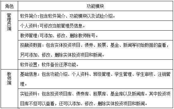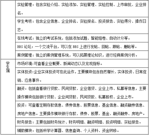 投(tou)融資決策實(shi)驗是(shi)由學(xue)生扮演(yan)各種企(qi)業,教師給定企(qi)業的初始資金(jin)(jin),分為固定資產(chan)和(he)流動資金(jin)(jin)兩部分,學(xue)生可以合理分配流動資金(jin)(jin),利用銀行存(cun)款、銀行貸(dai)款、債券(quan)、股票、基金(jin)(jin)、融資融券(quan)、房地產(chan)、企(qi)業間(jian)貸(dai)款、民間(jian)貸(dai)款、私(si)募(mu)股權、企(qi)業上市等投(tou)融資手段,積累實(shi)體投(tou)資資金(jin)(jin)。