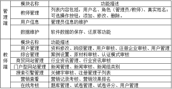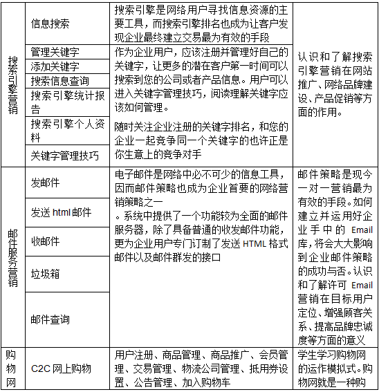 1、軟(ruan)件用戶(hu)從(cong)初(chu)次訪問企業(ye)網(wang)站(zhan)到跟該企業(ye)訂(ding)購產品的(de)整個過程,可將(jiang)其分成三個階段:網(wang)站(zhan)建設階段、營(ying)銷推(tui)廣階段和在(zai)線業(ye)務管理階段。模塊中應包(bao)括:網(wang)站(zhan)建設、搜索(suo)引擎(qing)營(ying)銷、郵件推(tui)廣、網(wang)絡(luo)溝通、信息搜索(suo)與(yu)發布、搜索(suo)引擎(qing)優(you)化、網(wang)絡(luo)廣告制(zhi)作(zuo)、、客(ke)戶(hu)服(fu)務、在(zai)線銷售等技能(neng)的(de)專項實訓,也能(neng)將(jiang)專項實訓匯總,方便(bian)學生開(kai)展(zhan)企業(ye)網(wang)站(zhan)綜合營(ying)銷、作(zuo)出網(wang)絡(luo)營(ying)銷效果評估等的(de)集中實訓。