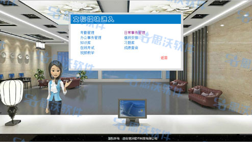 思沃文秘(mi)虛擬仿(fang)真實(shi)(shi)訓系統是我(wo)公司依(yi)據文秘(mi)專業(ye)相(xiang)關課程,結合(he)3D動態場景(jing)技(ji)術,引(yin)入(ru)實(shi)(shi)際文秘(mi)工作中(zhong)的(de)相(xiang)關案(an)例,融合(he)開發的(de)一款針(zhen)對(dui)文秘(mi)專業(ye)實(shi)(shi)訓的(de)應用型教學(xue)平臺(tai)軟(ruan)件。