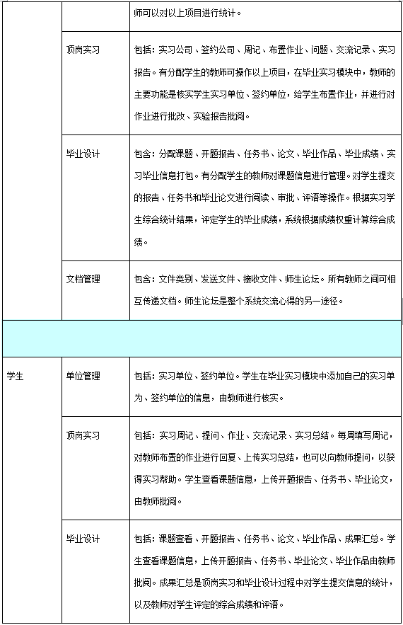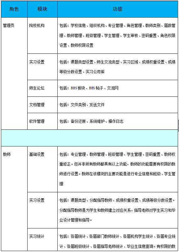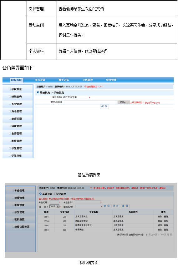 軟(ruan)件按(an)管(guan)(guan)理(li)員(yuan)、教(jiao)(jiao)師(shi)、學生(sheng)分為三種(zhong)用戶權(quan)限(xian)。其(qi)中(zhong),管(guan)(guan)理(li)員(yuan)設置軟(ruan)件基礎(chu)信息,包(bao)括:學校信息、院校組織機構、屆數年份管(guan)(guan)理(li)、教(jiao)(jiao)師(shi)類別、權(quan)限(xian)管(guan)(guan)理(li)等(deng)。教(jiao)(jiao)師(shi)根(gen)據(ju)權(quan)限(xian)不(bu)同,功能模(mo)(mo)(mo)塊不(bu)同,只有開通了權(quan)限(xian)的(de)教(jiao)(jiao)師(shi)可操作相應(ying)的(de)功能。教(jiao)(jiao)師(shi)角(jiao)色的(de)主要(yao)模(mo)(mo)(mo)塊包(bao)括:系統設置、統計查看、畢(bi)業(ye)(ye)實習、畢(bi)業(ye)(ye)設計、成績管(guan)(guan)理(li)、輔助(zhu)工(gong)具。學生(sheng)在實習期間,應(ying)按(an)時填寫周記,完(wan)成教(jiao)(jiao)師(shi)的(de)作業(ye)(ye),在有疑問時還可以向(xiang)教(jiao)(jiao)師(shi)提問。學生(sheng)端的(de)主要(yao)模(mo)(mo)(mo)塊有:畢(bi)業(ye)(ye)實習匯總、畢(bi)業(ye)(ye)實習、畢(bi)業(ye)(ye)設計、成績查看、輔助(zhu)工(gong)具