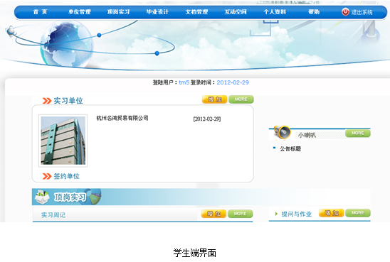 便于教(jiao)師的(de)(de)優質資(zi)源共享,加(jia)深教(jiao)師之間合(he)作。學(xue)生的(de)(de)問題及(ji)時得(de)以(yi)解決(jue),分享經(jing)驗,探討得(de)失。學(xue)生可以(yi)提交實習單(dan)位的(de)(de)工作介紹以(yi)及(ji)簽(qian)約單(dan)位,供(gong)教(jiao)師查閱。